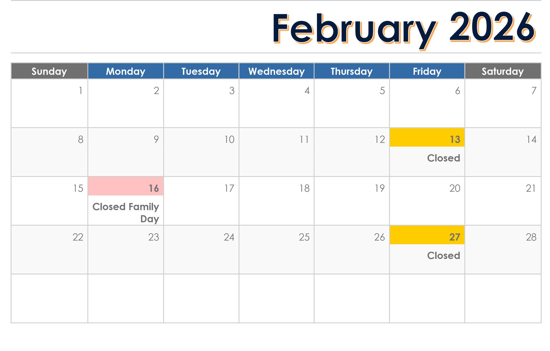 Closed for Lunch (12-1pm) & Every 2nd Friday