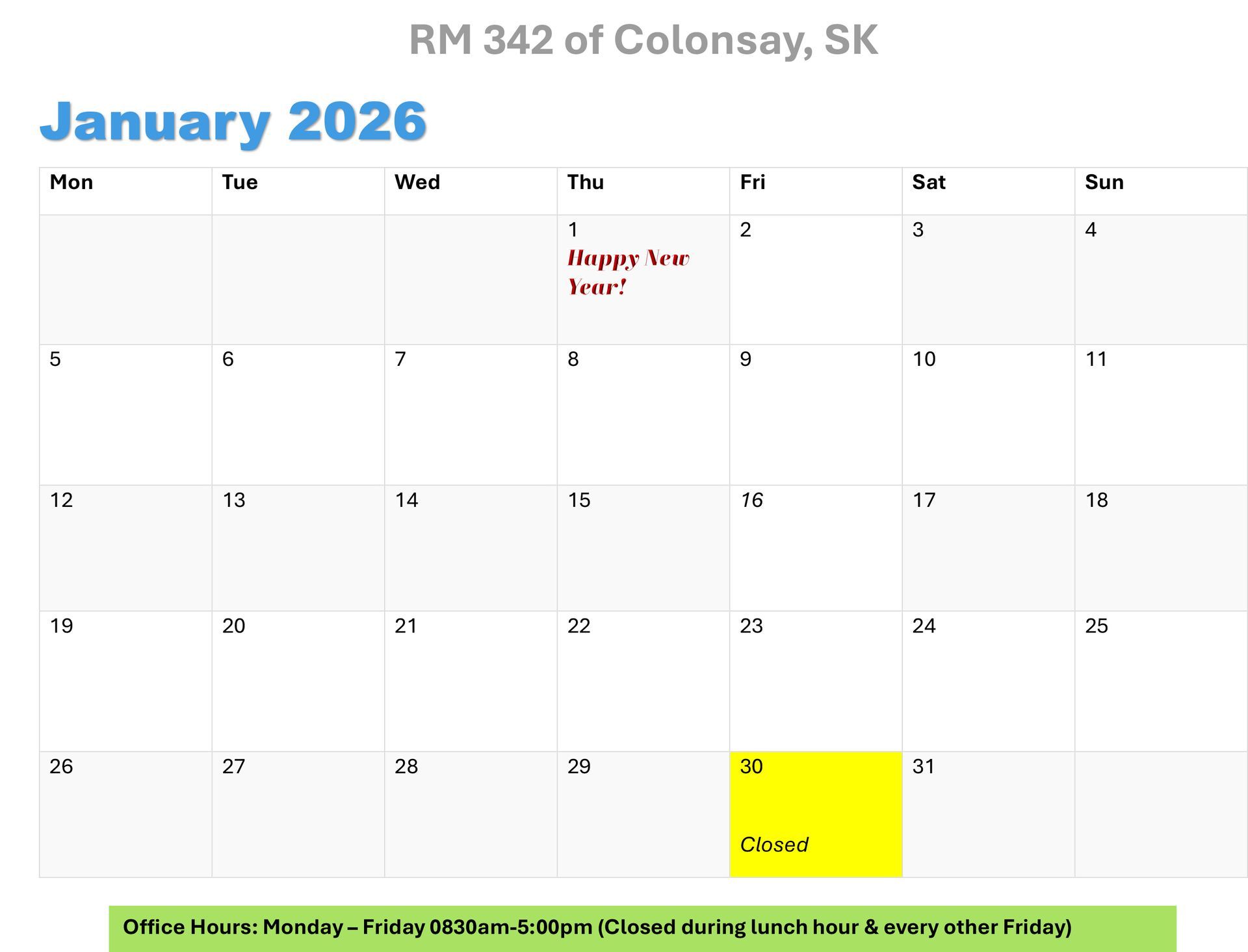 We provide a policy basis for the orderly management of land use, subdivision, municpal services, and public utilities within the RM of Colonsay in compliance with provincal legislation.